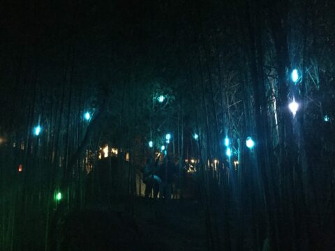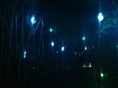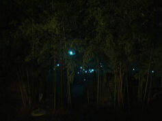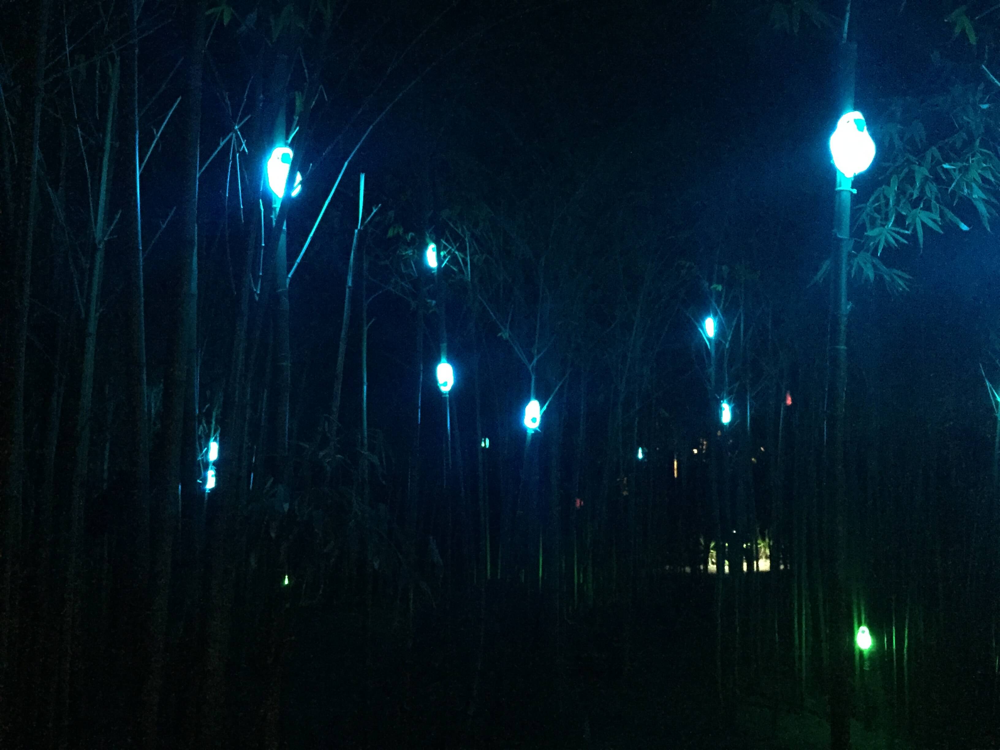 The light and sound installation was designed for a bamboo forest, and comprises a networked swarm of glowing, organic forms attached to the bamboo trunks which are responsive to the viewer’s presence.