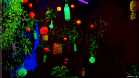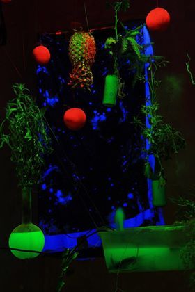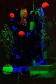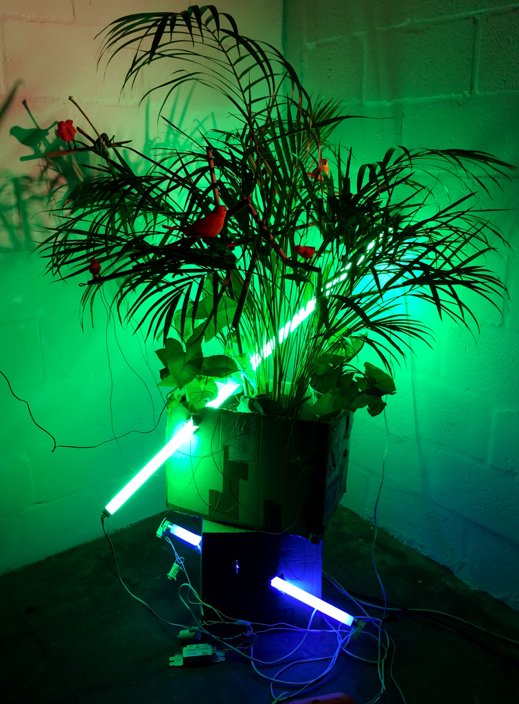 Paradigm Lost robotic birds, palm tree, Nokia 3310, lights, cardboard boxes 2016
